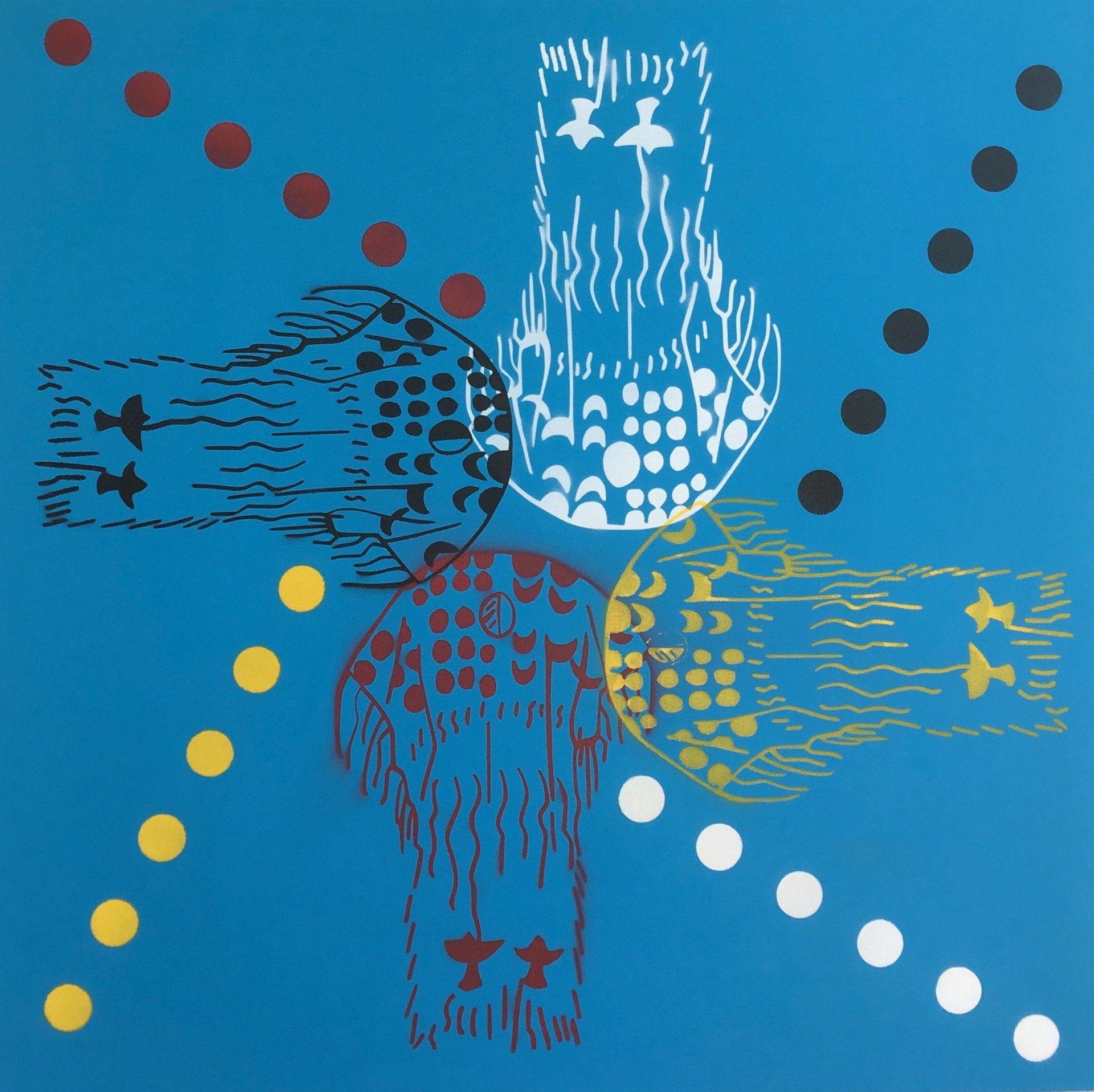 Acrylic, ink and spray paint on canvas,